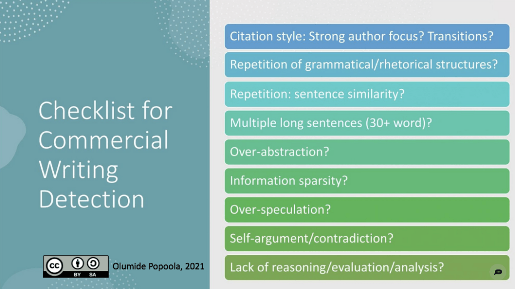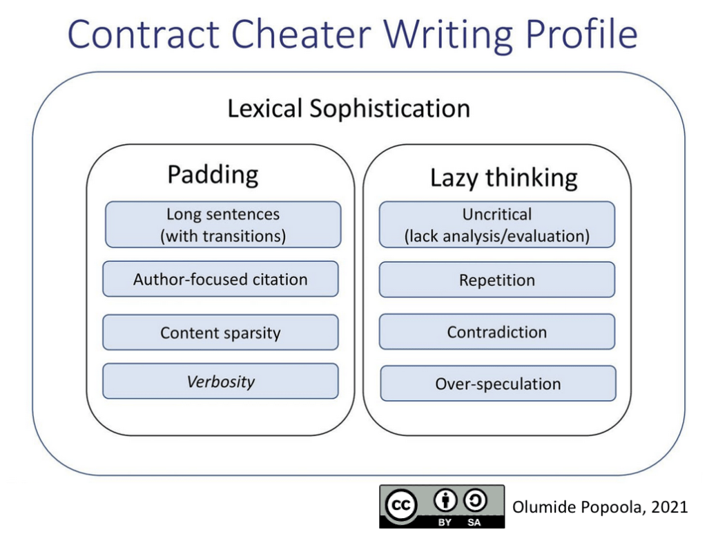 […] We’ve begun to see some interesting work looking at contract cheating detection (as I have previously outlined in this blog post). Olumide Popoola has developed an alternative stylometric approach for identifying contract cheating, which shows a lot of promise. Olumide has also identified methods of differentiating paid for essays from those written by students. More information is outlined here in Olumide’s blog post. […]